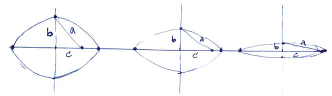 Profesor Bueno, tienen que ver con la forma en que el plano que corta al cono gira sobre un vértice fijo en el cono. Si el plano gira de manera que la elipse se hace cada vez más grande y los focos están cada vez más distantes entre ellos, la elipse tiende a la parábola [SCK-ACP-4]. Y si el plano inclinado gira de manera que el otro vértice de la elipse se va hacia el vértice del cono, entonces la elipse se hace cada vez más alargada y tiende a un segmento [SCK-ACP-5].