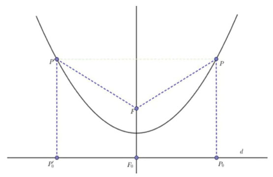 According to Lima (2014), point P belongs to the parabola with focus F and directrix, since the distance from point to is the same distance between point P and P 0 . Then, d ( P,F ) = d ( P,P o ), with the segment PP 0 perpendicular to the directrix and the perpendicular FF 0 drawn from the focus on the directrix is configured on an axis of symmetry.