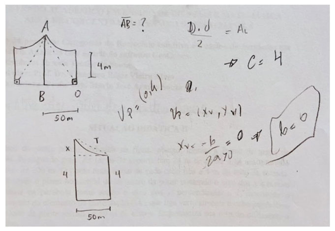 Almost unanimously, the inductive reasoning (L1) presented by the students revolved around the use of the quadratic function to solve the problem. As predicted in the a priori analysis, due to the fact that the parabola is recurrently studied in the school/academic path through the perspective of quadratic functions, this model was replicated, intuitively, and perhaps even naturally. However, some of them used different initial strategies during the situation of formulation, as the case of P5 and P2, reported in the subsequent paragraphs. For example, participant P5 started his elaboration looking for a solution through Plane Geometry, as shown in Figure 4: