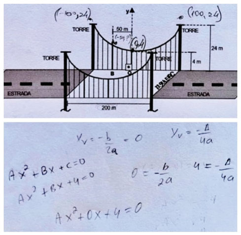In the situation of action, we expect the student to identify the elements provided in the question, associated with the image of the suspension bridge, in order to elaborate their strategies. One possibility is that the student, involved in 1st level reasoning mechanisms, observes, and analyses the presented scheme, recognizing elements such as the origin of the coordinate system, the vertex of the parabola at the point V ( 0, 4 ) , or even that the point (100, 24) belongs to the described curve.