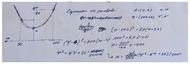 It should be noted that these students sought to extract as much information as possible based on the problem data, structuring an analytical reasoning (L2) and starting with a deductive reasoning (L3). According to the perspective of Brousseau and Gibel (2005), we understand that there is a need for subjects to prove that the reasoning elaborated was intentional, purposeful, and useful, with regard to their mathematical knowledge. Still regarding the formulation situation, one participant used the parabola equation in Analytical Geometry to solve the question, which was not foreseen in the a priori analysis. P3 used the presented model (Figure 7):