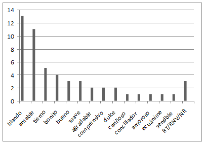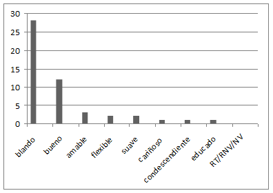 El análisis frecuencial comparativo de los resultados arrojados a partir de esta prueba asociativa nos ayuda a constatar la marcada diferencia entre las respuestas más frecuentes y las menos frecuentes. Puede observarse este hecho en la distancia entre, por ejemplo, blando-educado (C1), mostrada en la gráfica 3, y blando-conciliador (C2), mostrada en la gráfica 4, para la categoría adjetivo aquí analizada, lo que pone de manifiesto que la relación de contraste, frente a la de similitud, muestra una fuerte dependencia del significante. De hecho, todos los antónimos tienen sinónimos que los hablantes no identifican de forma tan inmediata como tales, como han mostrado estudios anteriores.