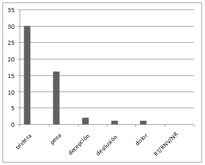 Las gráficas 5 y 6 ilustran la frecuencia registrada de las respuestas obtenidas en la prueba de contraste para el sustantivo alegría en los dos contextos analizados (C1 y C2).