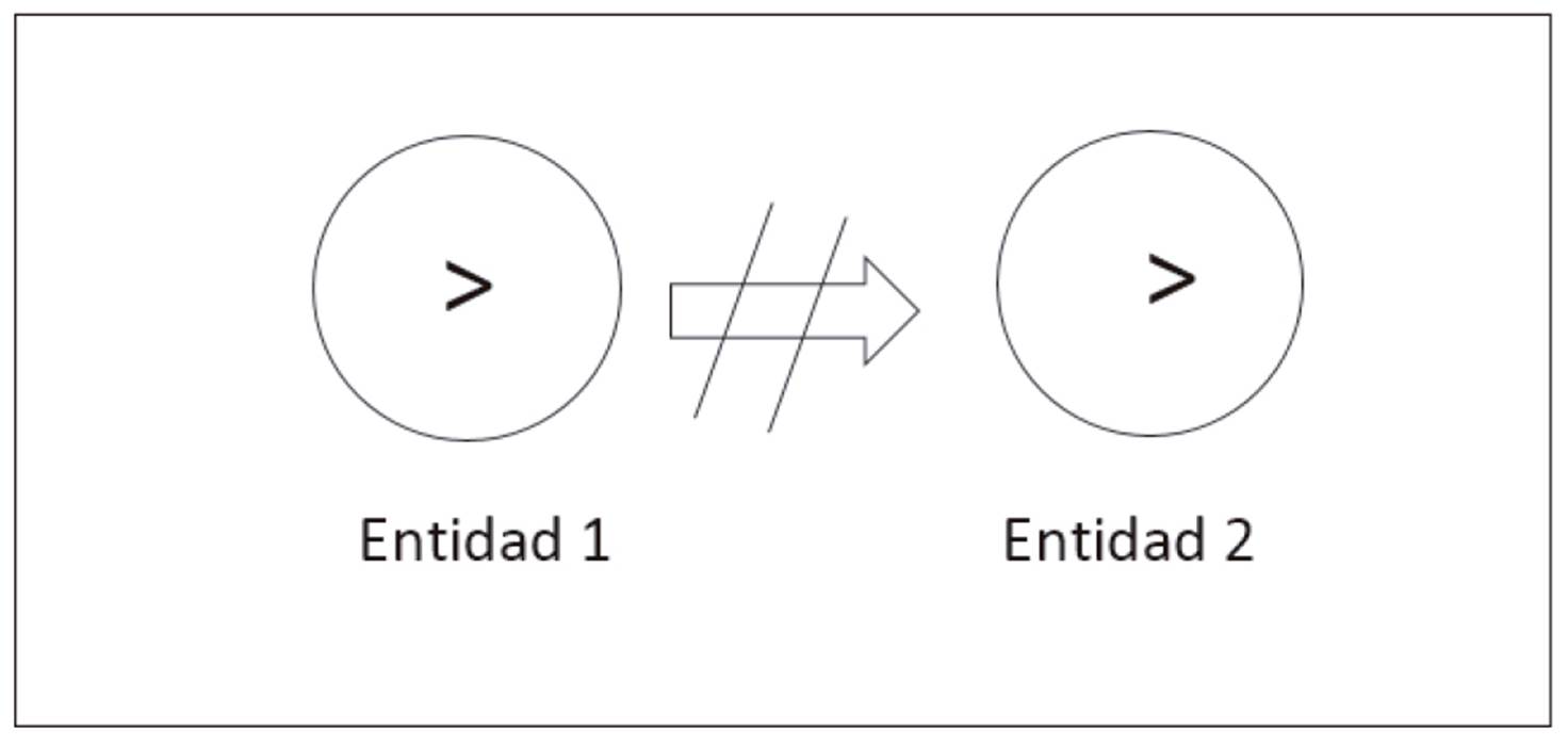 De acuerdo con el esquema 4, la entidad 1 con rasgos [+humano] [+activo] ejecuta una acción (>) de manera independiente a la entidad 2 con rasgos [+animado] [+activo] que también es dinámico por su cuenta (>). La flecha cancelada con líneas diagonales representa la ausencia de interacción entre ambos participantes.