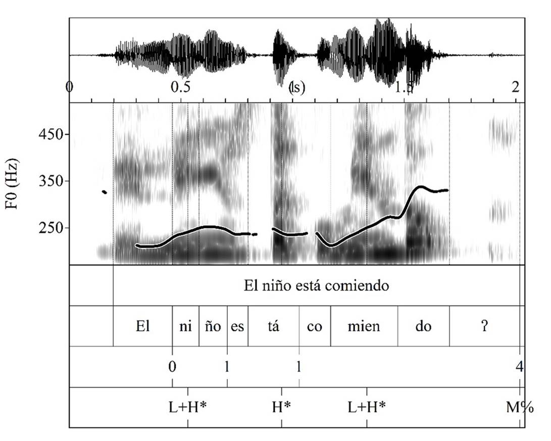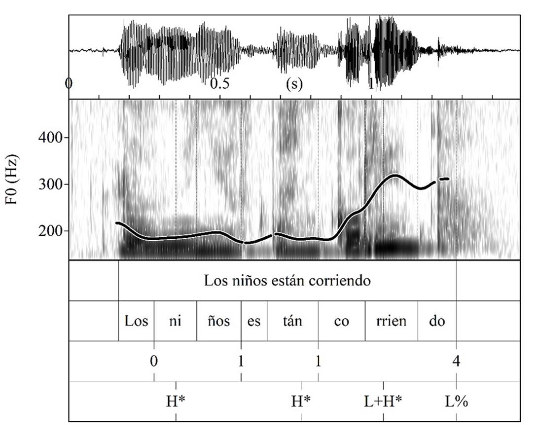 En el enunciado declarativo Los niños están corriendo, la sílaba nuclear -rrien- presenta el mayor ascenso de toda la emisión, mientras que el pretonema transcurre de manera relativamente plana (figura 2). Incluso en los enunciados con el tonema H* L%, el pretonema mantiene una realización plana o sostenida. Por su parte, el pico en la sílaba nuclear se presenta antes de finalizar la sílaba para culminar con una juntura descendente.