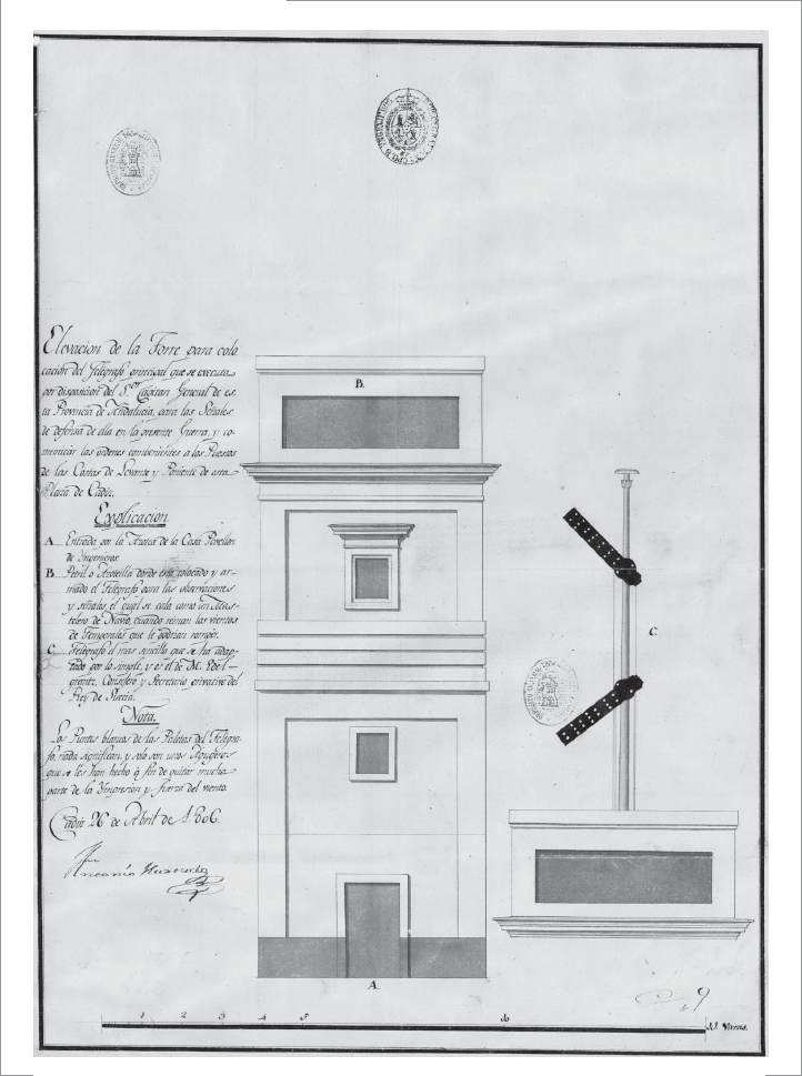 Pese a estos inconvenientes, las actividades continuaron a buen ritmo. En marzo de 1819, quedó concluida la primera de las torres,54 que estaba equipada con escaleras “para la comunicación de los tres cuerpos”, ventanas en la habitación del telegrafista y algunos conductos para arrojar granadas. También quedaron terminadas el aspa grande del semáforo y el eje de hierro que sostendría la maquinaria.55