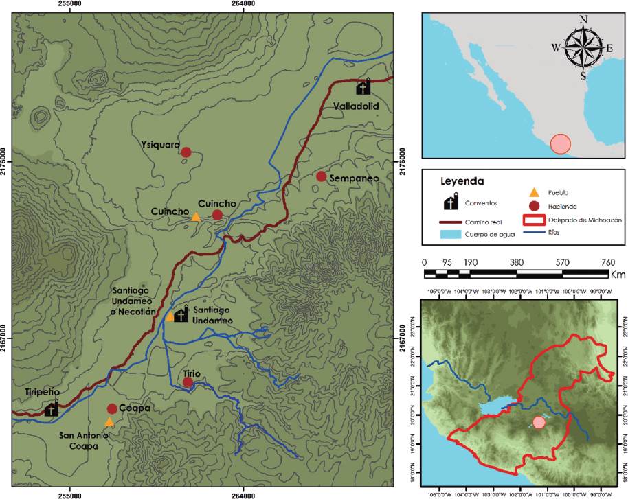 El área de estudio se sitúa en la porción sur de la cuenca del lago de Cuitzeo, a una altitud que va de los 2 100 a los 3 000 msnm, en la cumbre más elevada, que es el cerro El Águila. Se trata de una zona montañosa que forma parte del Eje Volcánico Transversal Mexicano. La región se caracteriza por un clima templado y lluvias moderadas. El topónimo de Undameo, “Lugar entre tres ríos”, remite a la riqueza hídrica del lugar. El principal afluente lo constituye el río Grande, que atraviesa también la ciudad de Morelia (antigua Valladolid) y que desemboca en el lago de Cuitzeo, al norte. La triada a la que alude el topónimo del pueblo se complementa con el río Tirio y el Santa Rosalía. Desde el siglo XVI, la posición geográfica fue clave en la estructuración territorial del occidente novohispano. Las descripciones geográficas de la provincia de Michoacán hacen referencia a que el pueblo de Santiago Undameo-Necotlán estaba asentado junto al camino real que vinculaba a la ciudad de México con Valladolid y, más al noroccidente, con reino de la Nueva Galicia y la ciudad de Guadalajara (Ochoa y Sánchez,1985, p. 112). Esto se puede visualizar en la Figura 1.