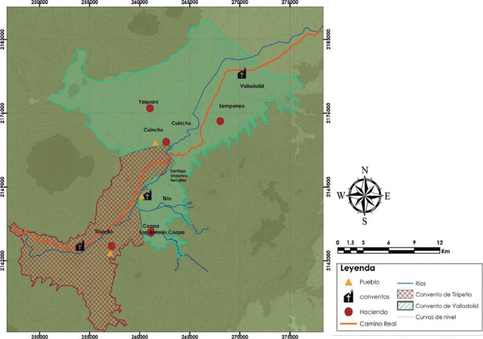 Figura 2 Ubicación de conventos y haciendas administradas por los conventos de Valladolid y Tiripetío en el siglo XVIII
