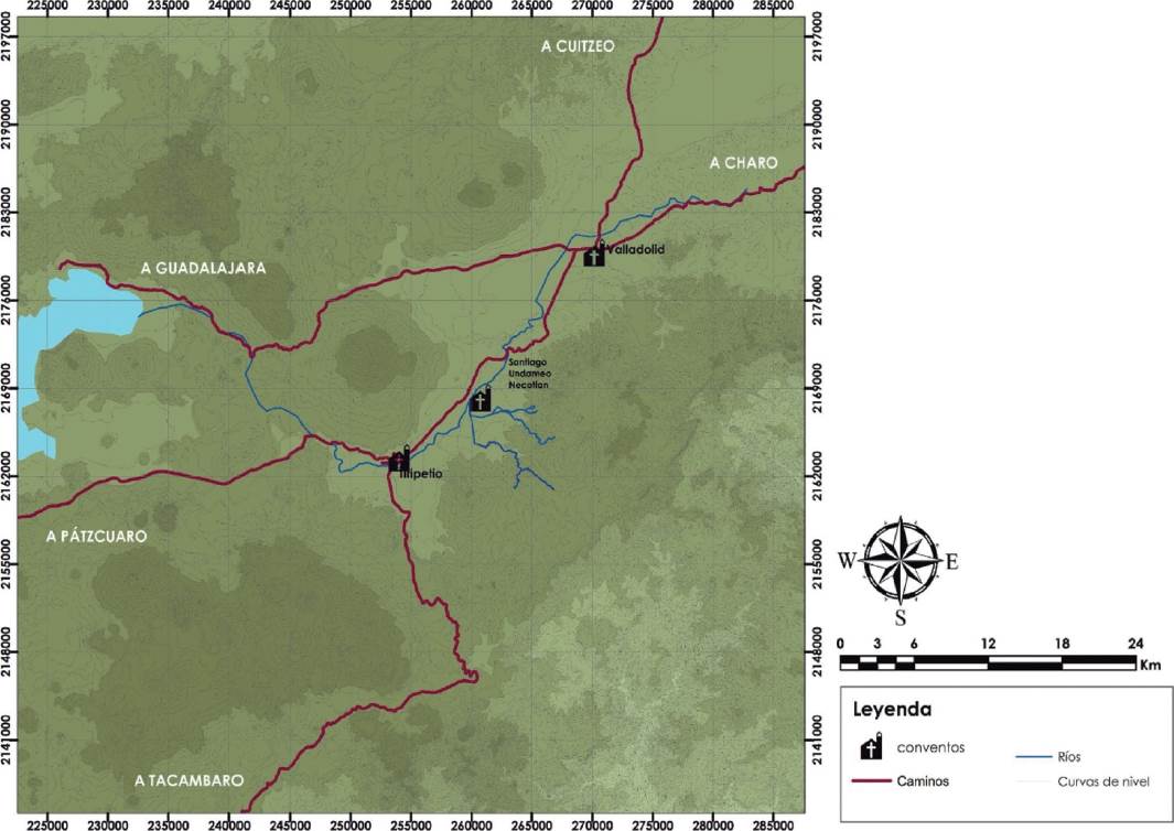 Se analizaron también las Relaciones Geográficas de los pueblos de Tiripetío (1580) y de Santiago Undameo (1579), cuando se llamaba Necotlán,2 las cuales brindaron los antecedentes sobre la fundación de estos poblados (Acuña, 1987, pp. 185-87, 339-46). A su vez, las crónicas agustinas son documentos que contribuyeron en gran medida a esta investigación. En primer lugar, para reconocer la historia de la orden desde diferentes épocas y momentos (De Grijalva, 1624, pp. 35-42, 86-88, 461-62), brindando el panorama en el cual arribaron a la región, y establecieron las primeras fundaciones (Basalenque, 1673, pp. 31-40), registraron a los pueblos y se vincularon con personajes claves para llevar a cabo la misión. En segundo lugar, brindaron descripciones muy ricas del paisaje, la percepción que tuvieron de los elementos de la naturaleza como ríos, montañas, árboles, plantas y flores (De Escobar, 1729, pp. 296-97).