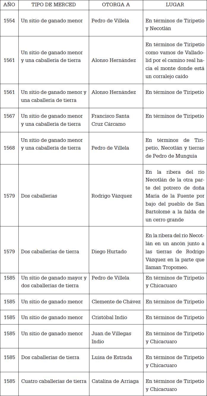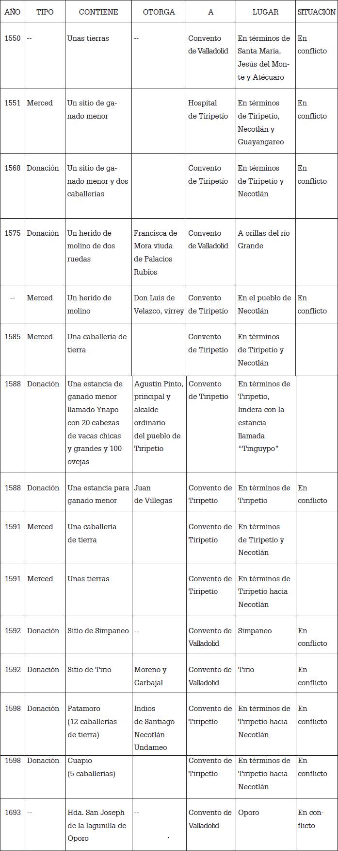 Se tiene registro que desde 1550 los agustinos recibieron algunas mercedes, como la otorgada por el virrey Luis de Velasco al convento de Tiripetío, para un herido de Molino en las inmediaciones del pueblo de Necotlán, merced que para el siglo XVIII entraría en conflicto con los indios de Santiago Undameo (ver Figuras 6 y 7).