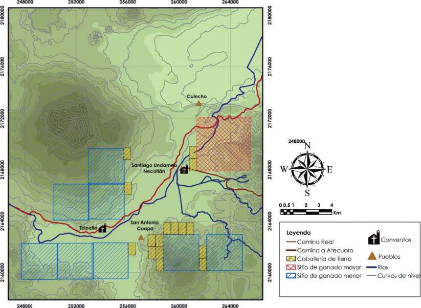De la breve descripción que se tiene de las tierras de Cuapio, se deduce que las cinco caballerías de tierra se ubicaron cercanas a lo que probablemente fue el camino real que iba de Atécuaro hacia Santa Rosalía y el río que corría entre ambos pueblos. Para su ubicación geográfica, se identificó el topónimo de Cuapio en su posición histórica, que correspondía a la desviación de un río. Hacia el sur lindaba con las tierras de Chicacuaro (Checaquaro) y cercana a los límites de la hacienda de Tirio. Para situar las 12 caballerías de tierra de Patamoro, se ubicó el paso del río Grande y el camino real, con la precaución que se debe tener en cuenta al momento de la marcar puntos geográficos para un sig, a partir de la información de fuentes históricas.