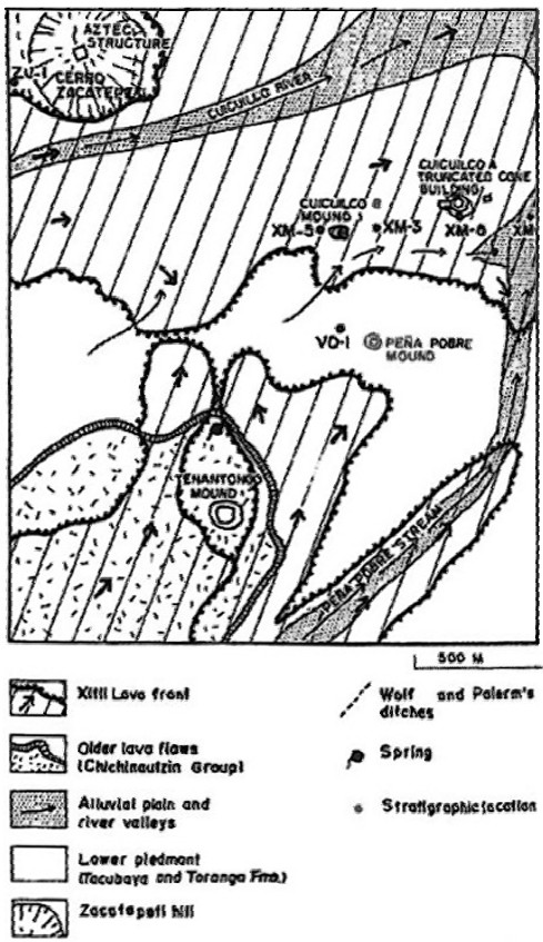 Figura 1 Reconstrucción del paisaje del sitio Cuicuilco-Peña Pobre, describiendo los tipos de suelos del área