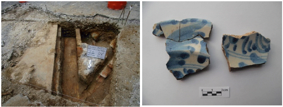 Figura 10 Evidencia de un canal que afirma el uso de obras hidráulicas a fin de encausar el agua hacia los cultivos en la hacienda La Peña Pobre; los restos arquitectónicos y constructivos se encuentran asociados a materiales cerámicos diAGNósticos del periodo virreinal como el tipo Mayólica azul/blanco
