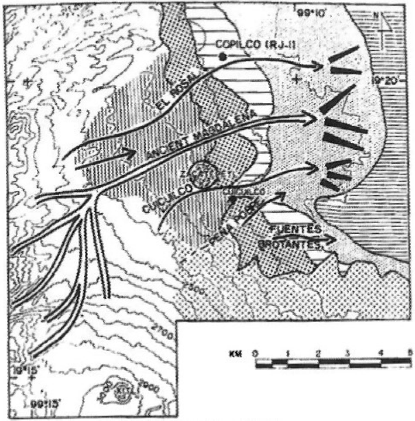 Figura 2 Cartografía de Tlalpan en la que se indican las áreas Zacayuca, Zacatepetl y Peña Pobre, en zonas libres de lava que muestran un abanico aluvial propicio para el establecimiento humano y agrícola. Escala: 1:25 000