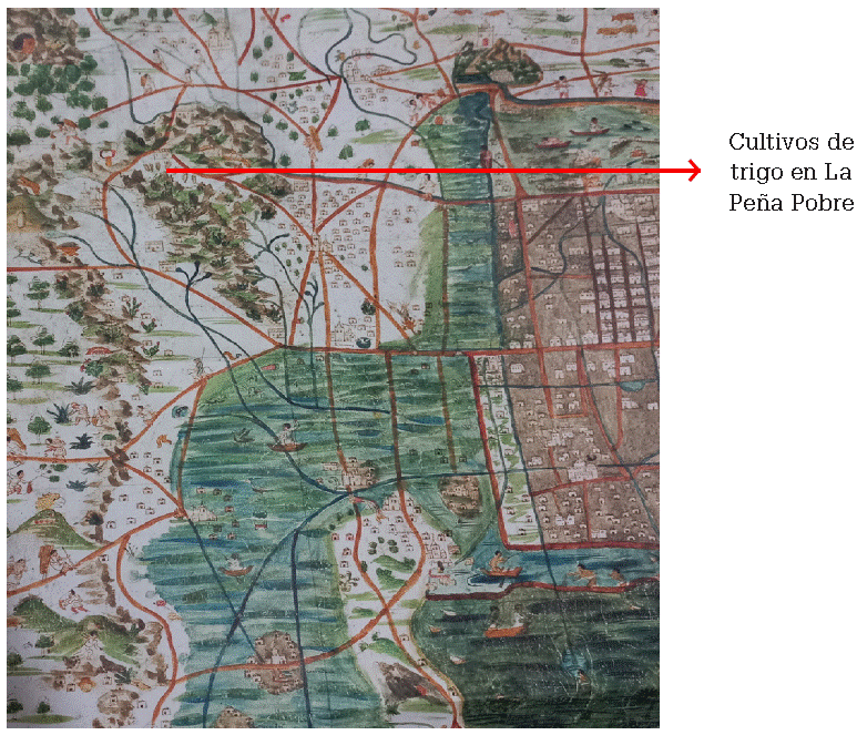 Figura 6 Mapa México-Tenochtitlán. Cultivo de trigo en La Peña Pobre; esta es una de las evidencias más tempranas del periodo novohispano sobre la práctica agrícola del trigo ilustrada en la Cuenca de México