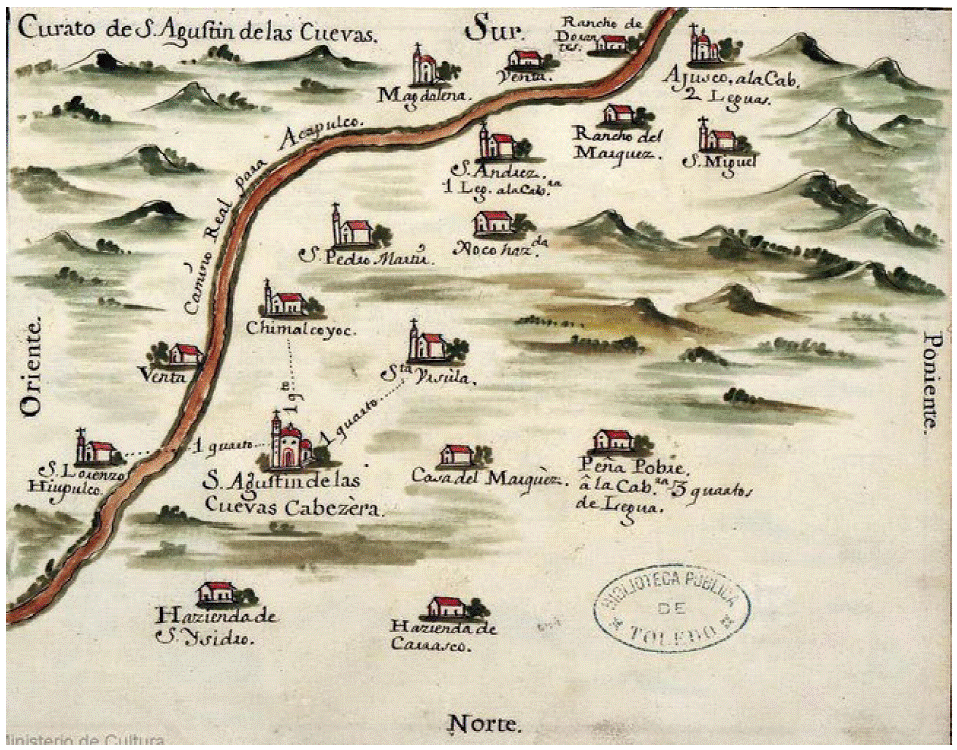 Figura 7 Cartografía que indica la cabecera San Agustín de las Cuevas, algunas haciendas como La Peña Pobre, ranchos y el Camino Real para Acapulco