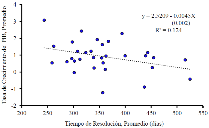 La gráfica 1 ilustra la relación entre tasa de crecimiento promedio de las entidades y el tiempo promedio que tomó resolver conflictos comerciales en ellas, en el periodo 2006-2013. Se puede observar una clara relación negativa y significativa entre estas dos variables6; lo cual es evidencia a favor de lo argumentado por North (1990), quien afirma que un sistema judicial eficaz en hacer cumplir contratos, es un determinante fundamental del desempeño económico.