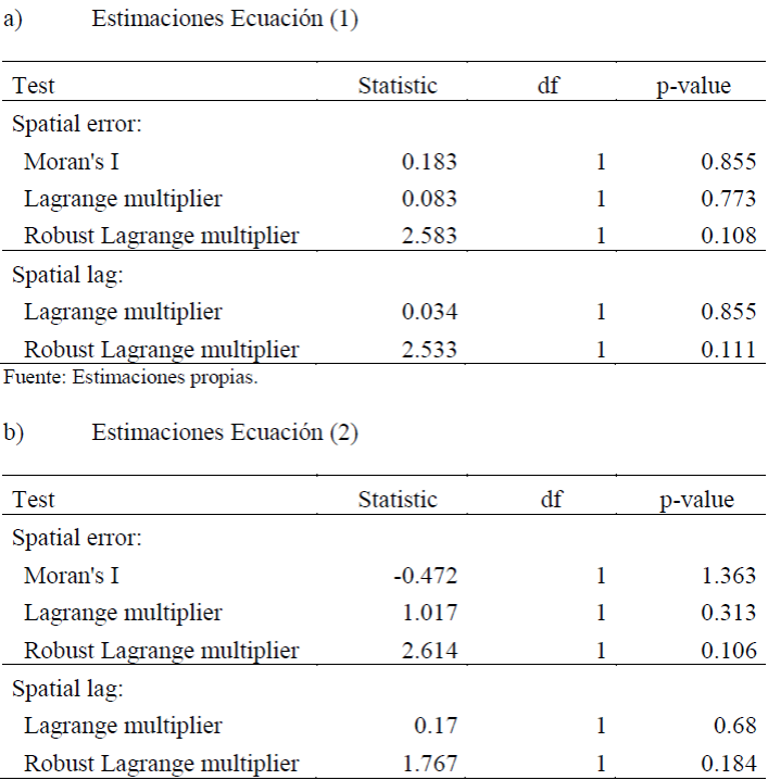 Respecto de los estadísticos de diagnóstico, la prueba de Ramsey señala que las estimaciones consideradas están correctamente especificadas, al tiempo que tampoco podemos rechazar la hipótesis de normalidad en los residuales. Finalmente, con el propósito de descartar algún proceso de dependencia espacial en las estimaciones, se aplicaron pruebas para detectar la presencia de este tipo de efectos a las estimaciones de las ecuaciones (1) y (2). De encontrar evidencia en este sentido, estaríamos en presencia de estimaciones sesgadas e ineficientes (LeSage y Pace, 2009). Definiendo una matriz de dependencia espacial con base en el criterio de contigüidad entre entidades federativas, los resultados que se muestran en el anexo 3 señalan que no existe presencia de este tipo de efectos, tanto en el término de error (spatial error) como en la variable dependiente (spatial lag).