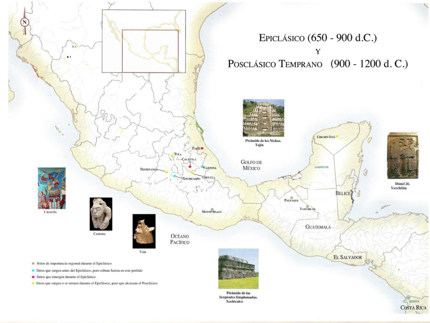 Figura 1 Algunos sitios del Epiclásico y del Posclásico Temprano. Se marca la localización de Xochicalco y de Tula.