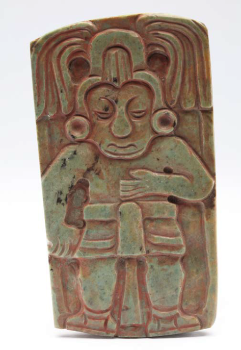 Una placa o pendiente de jade […] cuyo bajo relieve representa a un personaje con los brazos sobre el pecho, tocado […] de fauces de serpiente y dos caras de perfil en la parte superior a uno y otro lado del tocado […]; un pendiente antropomorfo de jade con tocado estilizado figurando fauces de un ofidio […]; otro pendiente, cabecita antropomorfa en jade, con tocado muy estilizado imitando fauces de serpiente [ibid.: 13]. (Figuras 4 y 5)