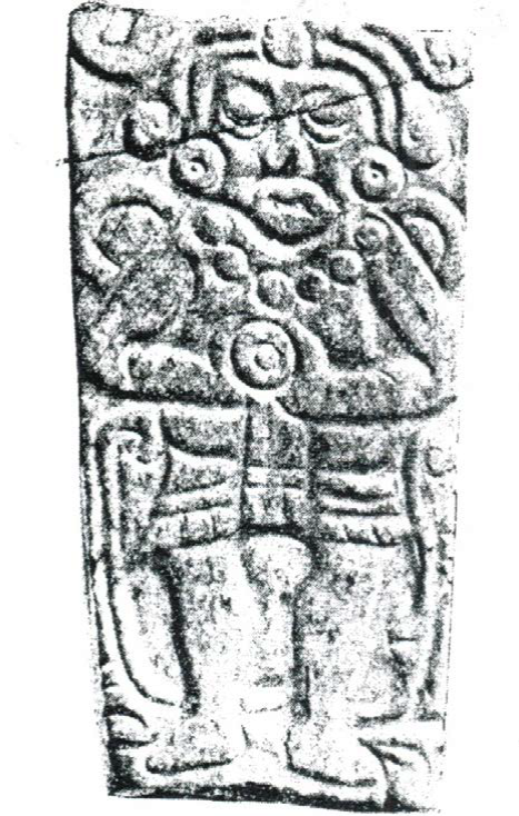 La placa fue usada seguramente como pectoral, en vista de que tiene dos perforaciones laterales. Sobre una de sus caras tiene esculpida una bella figura humana vista de frente. Los cabellos están sujetos sobre la frente con un adorno circular y caen a los lados con rizos. Lleva dos orejeras circulares y sobre el pecho pende un collar de cuentas esféricas. Tiene las manos sobre el tórax […] El cuerpo está desnudo, con excepción de una corta faldilla con flecos que está amarrada al frente con una ancha cinta. No lleva calzado […] Es importante, además, que el individuo lleva los ojos cerrados, lo que hace suponer que se trata de la representación de un muerto [ibid.: 152-153]. (Figura 13)