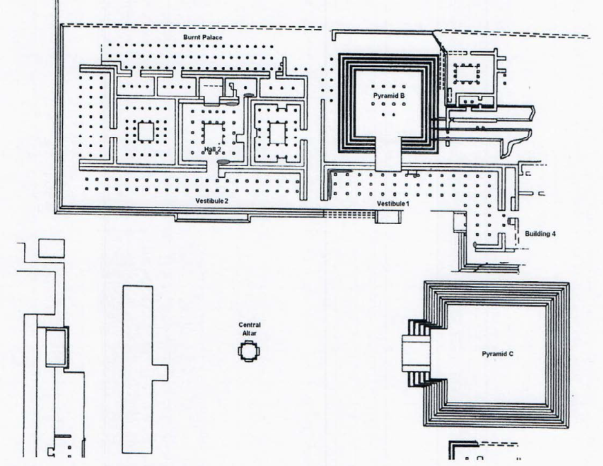 Figura 14 Sección del recinto sagrado de Tula. Se aprecia el Palacio Quemado, los vestíbulos y la Estructura B. Se sombrean las banquetas con personajes.