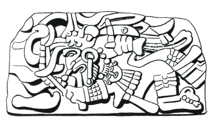 De entre las lápidas excavadas en la Sala 1 del Palacio Quemado destaca una que representa a un personaje barbado. De acuerdo con el responsable de su exploración, el personaje: