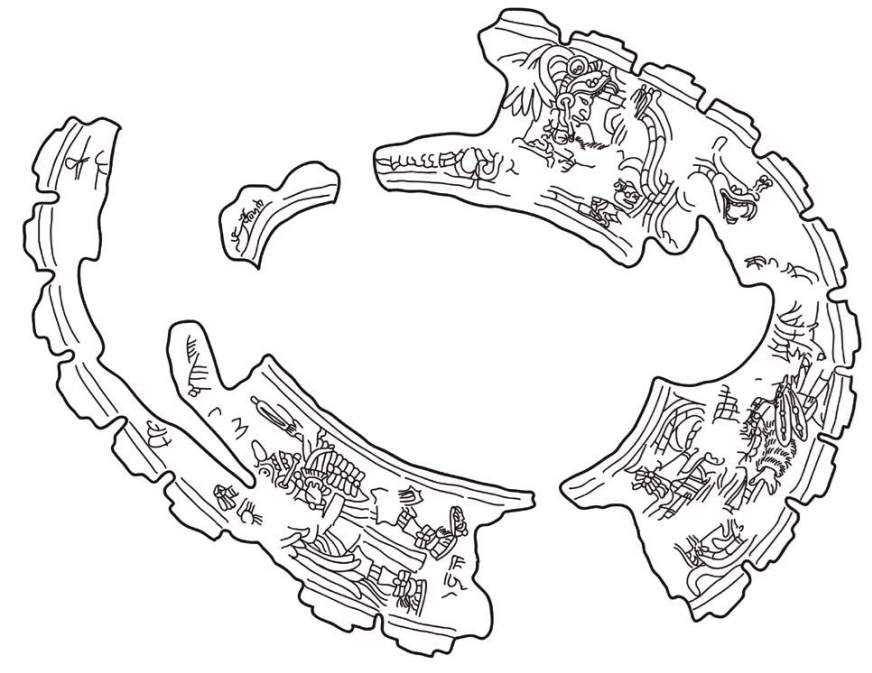 Figuras 10 y 11 Placa asociada con el Entierro 1 de la Pirámide de las Serpientes Emplumadas y objeto de la Tumba II del Templo XVIII de Palenque.