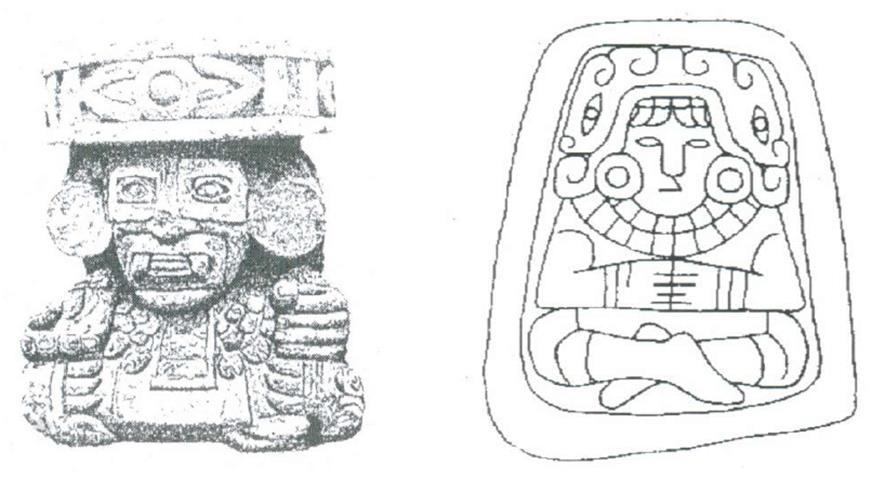 Figuras 20 y 21 Dios enmascarado del fuego. Nótese la reliquia que pende de su cuello; reliquia excavada en el escombro del Templo Mayor de Tenochtitlan.