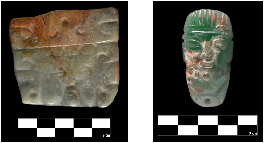 Dentro de la caja de piedra se recuperó una placa de piedra verde, dos conchas y 16 cuentas del mismo material: