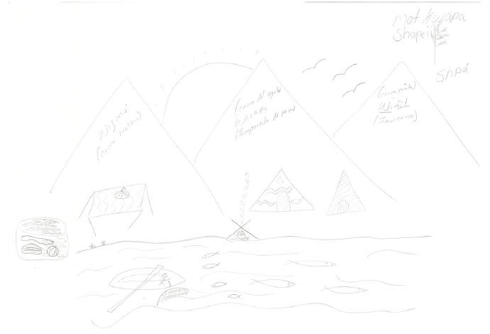 Figura 1. Mat Kwapa Shapeii o “Tierra indígena cucapá” en la traducción libre de Sonia Moreno. Tierra cucapah antes a orillas del Río Colorado. Elaborado por Sonia Moreno, noviembre de 2019. De acuerdo con la descripción de la autora, en este dibujo aparecen tres cerros: el Wi jmú o Cerro de los Molinos; el Wi shpá o Cerro del Águila, zona en la que se ubicaban durante la temporada de pesca; finalmente el Wi ñil o Cerro Prieto, área que ocupaban durante el invierno. Además se observa un brazo del Río Colorado, donde están representadas las lisas, uno de los peces que más consumían. Al centro está el fuego, a la derecha dos casas y a la izquierda una ramada de chachanilla y un pozo que cubrían con cachanilla para resguardar alimentos.