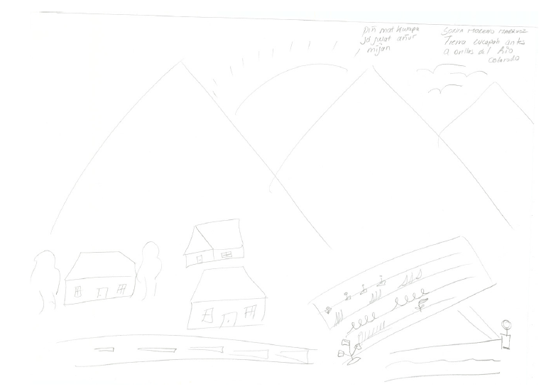 De manera general, estas tres cartografías comparten los elementos de referencia utilizados por Sonia y Antonia e Inocencia: los cerros o montañas, alguna corriente de agua (sea un río o un canal de riego) y la carretera. Incluso, el dibujo del niño que decidió trabajar solo es interesante porque, pese a que los elementos básicos sean su casa y el agua, el título del dibujo es El Águila, es decir unos cerros que aparece en el resto de los diseños indicado con el nombre Wi shpá.