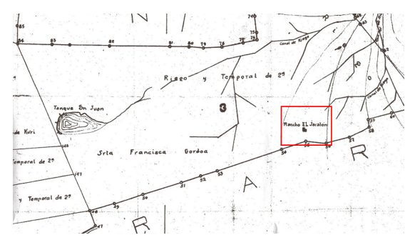 Figura 1. Acercamiento de la calca de los terrenos de Don Eugenio y Francisca Gordoa, en él se puede apreciar que no existe ninguna otra unidad productiva más que el rancho el Jacalón, señalada en el recuadro de color rojo; sin embargo, éste se encontraba lejos de la población actual.13