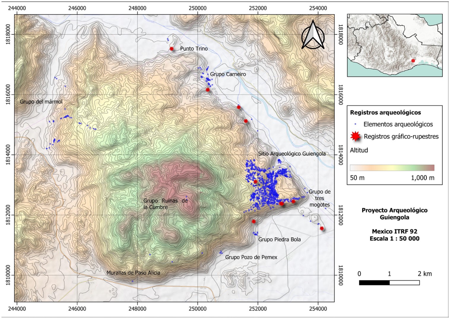 Mapa 1. Elementos arqueológicos y ubicación del sitio arqueológico Guiengola.
