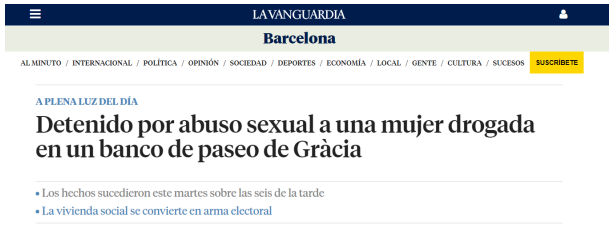 Fuente. Periódico La Vanguardia, 15 de mayo de 2019. <https://www.lavanguardia.com/local/barcelona/20190515/462256697716/detenido-abuso-sexual-mujerpaseo-gracia-barcelona.html>.