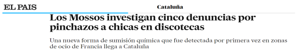 Fuente. Periódico El País, 26 de julio de 2022. <https://elpais.com/espana/catalunya/2022-07-26/los-mossos-investigan-cinco-denuncias-por-pinchazos-a-chicasen-discotecas.html>.
