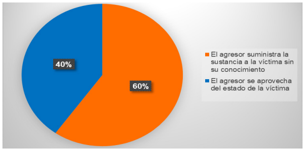 Del mismo modo, la mayor parte de las agresiones sexuales que ocurren por sumisión química se piensa que son proactivas, como muestran las respuestas de nuestras encuestadas. Lo más habitual, el 60%, cree que el agresor suministra algún tipo de sustancia a la víctima. Sin embargo, lo que realmente ocurre es la vulnerabilidad química. En un estudio realizado por García, Quintana y Cruz Landeira [2017], el 73% de las víctimas reconocieron haber consumido alcohol de manera voluntaria. Si a este hecho se le añade que se encontraron rastros biológicos en el 68.9% de las víctimas, se muestra cómo las agresiones eran oportunistas.