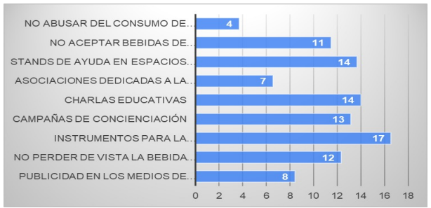 El efecto de estos discursos acerca de la minimización de los riesgos se puede observar en los resultados de nuestro cuestionario respecto a quién debe llevar a cabo las prácticas de cuidados, puesto que el 72% de las mujeres respondieron que son ellas mismas quienes deben implementar las prácticas de cuidados. Las opciones más votadas han sido aquellas que tienen que llevar a cabo las víctimas, como utilizar instrumentos de detección de drogas en la bebida, no perder el vaso de vista o stands de ayuda en espacios de ocio como se puede observar en el cuadro 7.
