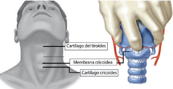 Primero es necesario que el médico se coloque en el lado derecho del paciente. La mano izquierda es usada para estabilizar la tráquea entre el dedo pulgar y el dedo medio, mientras que con el dedo índice hay que localizar la línea media de la membrana cricoidea. Para su correcta localización la membrana cricoidea se localiza entre el cartílago tiroides y el cartílago cricoides. Este sitio generalmente es muy pequeño y no es mayor a dos centímetros en el adulto, (Figura 1).