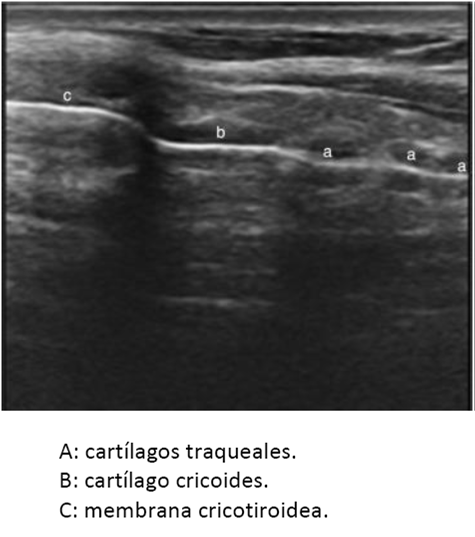 El uso de ultrasonido es de gran utilidad para poder identificar la membrana cricotiroidea, sobre todo en personas obesas q tienen abundante grasa en el cuello, a través de un corte longitudinal a lo largo de la laringe, se observa un estructura hipoecoica que se encuentra entre el cartílago tiroides y el cartílago cricoides. (Figura 2). A este nivel es posible identificar la membrana, empleando modo dopper color, vasos sanguíneos presentes sobre las estructuras laríngeas y traqueales, de tal manera que si se piensa realizar una punción translaríngea a ese nivel, se puede escoger el sitio en donde no se tenga riesgo de punción vascular (10).