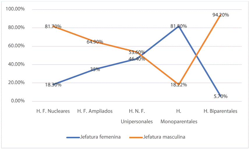 El alumnado de la escuela en la que se realizó el trabajo de campo procede de distintos tipos de familias, principalmente de familias monoparentales con jefatura femenina, a las que siguen las familias ampliadas y, en menor medida, la familia nuclear (INEGI, 2017). Como se observa en la Figura 1, la línea de color rojo es para los porcentajes referidos a los hombres y la azul para las mujeres; con base en los datos, se puede argumentar que los hogares monoparentales están encabezados por las mujeres y los hogares biparentales por los hombres. El abordaje de las familias de los alumnos se recupera en la actividad lúdica y en las entrevistas grupales mediante sus narrativas.