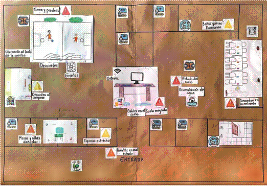 Producto: Mapa de riesgos (Figura 10) Se concreta a partir de la unión de los trabajos de cada subgrupo, estableciendo por cada lugar los siguientes riesgos: Cancha principal y secundaria: grietas en el suelo, desniveles, tierra y piedras, agua empozada (falta de sifones). Salones: espacio estrecho, mesas y sillas dañadas, salones sin vidrio en las ventanas. Baños: acumulación de agua en el piso, puertas en mal estado, baños que no funcionan, llaves dañadas. Comedor: cuando el suelo esta mojado, desorden al momento de ingresar. Sala de informática: enchufes que hacen corto, cables en el suelo. Cafetería: ubicación al lado de la cancha, desorden al momento de comprar, estado del suelo (caídas).