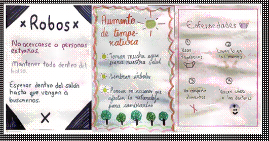 Estos productos reflejaron lo comprendido en el desarrollo de las actividades que componían cada sesión, pues evidencian las diferentes perspectivas y niveles de profundidad alcanzados por los estudiantes, al proponer y plasmar ideas comunes y creativas para reconocer los riesgos de su escuela y acciones a realizar ante ello.