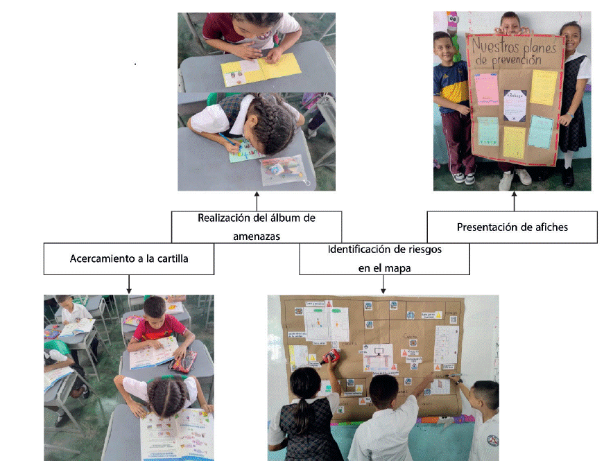 En este proceso, se destaca el diseño e implementación de material didáctico, como la cartilla, que facilitó la conexión entre la comunidad estudiantil de tercer grado y las condiciones de riesgo, ya que favoreció la conceptualización, contextualización y desarrollo de capacidades que se asocian con la cultura de la prevención y la responsabilidad social, que son principios orientadores del modelo y factores clave en la promoción de la gestión del riesgo; asociados con los principios generales establecidos en el artículo 3° de la Ley 1523 de 2012. Adicionalmente, permite identificar aspectos que llevan a mejorar la cartilla de actividades como material de apoyo.