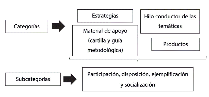 Lo anterior permitió identificar subcategorías (Figura 13) en los registros de observación de las sesiones implementadas, que son: la disposición, caracterizada por una actitud de interés sobre lo abordado por medio de la cartilla; participación en las actividades de diálogo, construcción de los nuevos conceptos desarrollados; ejemplificación desde el relato de experiencias y situaciones escuchadas o vividas en torno a los términos clave, y la socialización de los productos creados, en la que se reflejó su comprensión sobre las temáticas revisadas. De esta manera se da cumplimiento a las competencias planteadas para cada unidad.