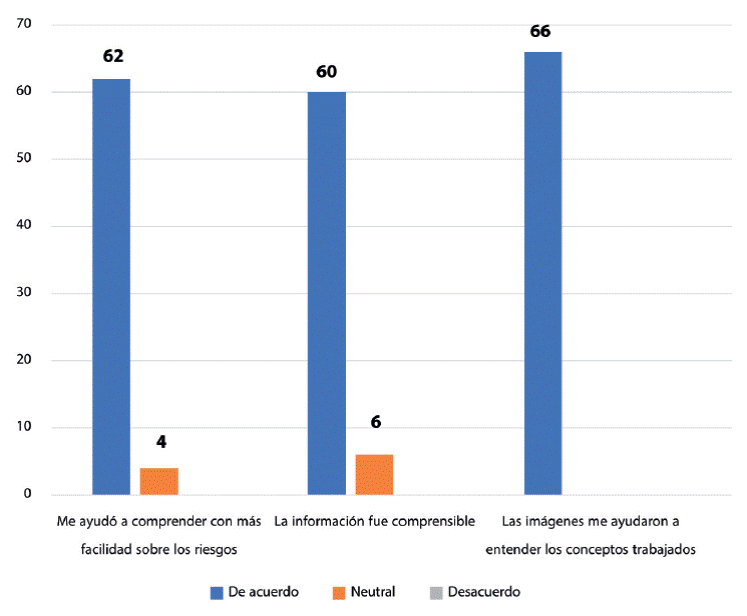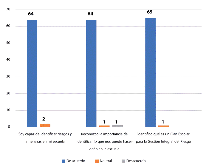 Los resultados mostraron un impacto significativamente positivo, evidenciado por un incremento superior a 86% en las respuestas de los estudiantes, lo que representó un cambio favorable en comparación con los resultados de las encuestas aplicadas inicialmente y reflejó, desde los ítems establecidos en la escala de Likert (Figuras 14, 15 y 16), su interés por participar en las actividades planteadas y su contribución al reconocer los conceptos clave, fortaleciendo la capacidad de reconocer riesgos, amenazas y vulnerabilidades del contexto.