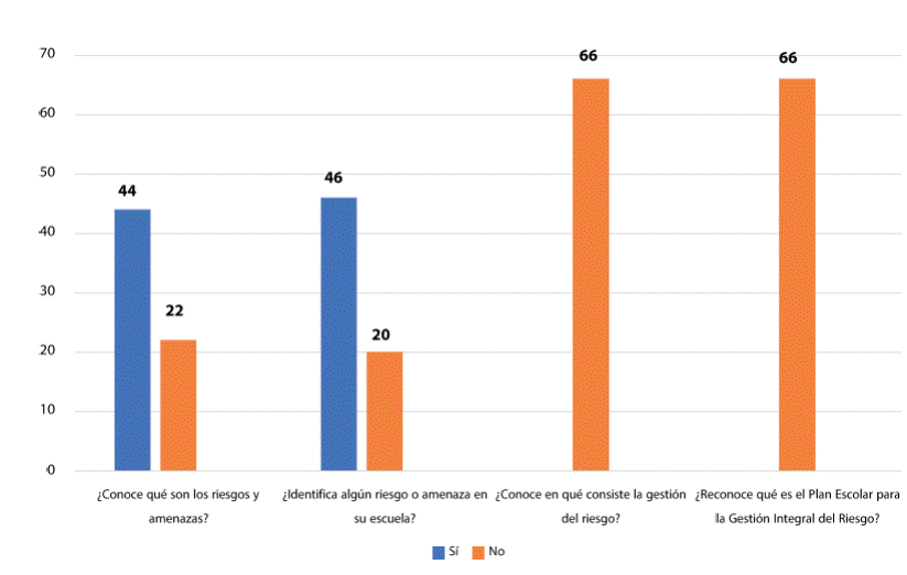 En la fase de análisis se realizó una encuesta de ocho preguntas a 66 estudiantes del grado tercero, en la que se exploraron los saberes previos sobre los riesgos, la gestión de éstos y las acciones implementadas por la IE para su promoción. En la Figura 2 se evidencia que reconocen de forma general los riesgos y amenazas, pero no los relacionan con la gestión del riesgo o el PEGIR.