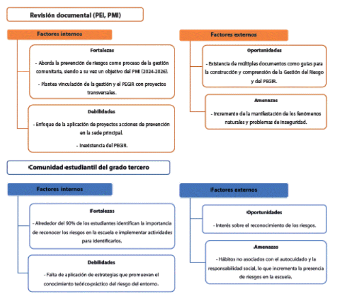 En relación con la revisión documental (PEI y PMI 2021-2023), se identificaron como debilidades el enfoque que se tiene hacia la aplicación de proyectos en la sede principal de la Institución educativa y la falta de construcción del PEGIR, lo que puede generar un impacto negativo por diversas problemáticas, entre ellas, el aumento de fenómenos naturales y la inseguridad del municipio. Se presentan como fortalezas la integración de la prevención de riesgos y el enfoque hacia la mejora desde la implementación de acciones para la gestión del riesgo, en el PEI y el PMI (2024-2026), y como oportunidad la diversidad de guías del MEN para la construcción del PEGIR, como punto de partida para lo promoción de la prevención en el contexto escolar.