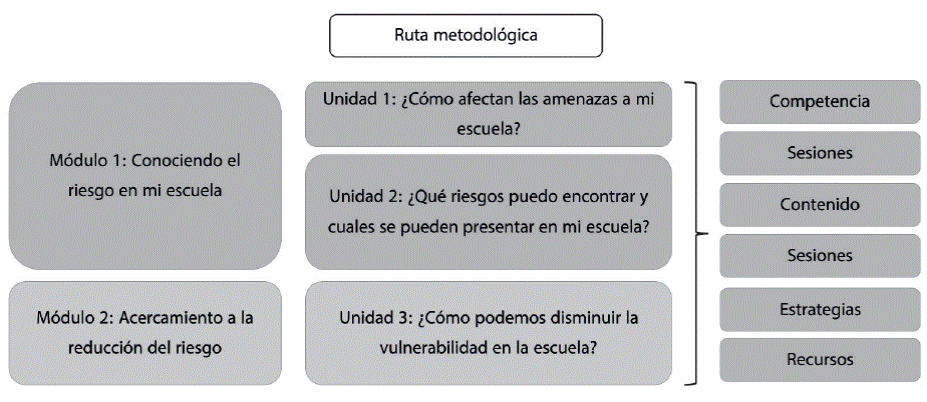 En la ruta mencionada se estructuró en tres unidades, cada una dedicada a explorar los conceptos fundamentales de amenaza, riesgo y vulnerabilidad. La metodología se basó en los procesos de gestión del conocimiento y reducción del riesgo, comenzando con la exploración de saberes previos de los estudiantes. Posteriormente, se profundizó en cada concepto a través de cartillas explicativas y se consolidó el aprendizaje mediante tres productos prácticos: álbum de amenazas, mapa de riesgos y afiches con acciones preventivas para el mural.