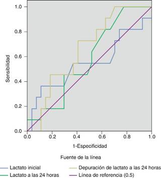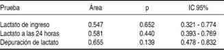 Mediante el análisis de curvas ROC para lactato inicial, lactato a las 24 horas y depuración de lactato (Figura 1 y Cuadro III) no se demostró diferencia significativa en relación con la curva de referencia (p > 0.05).
